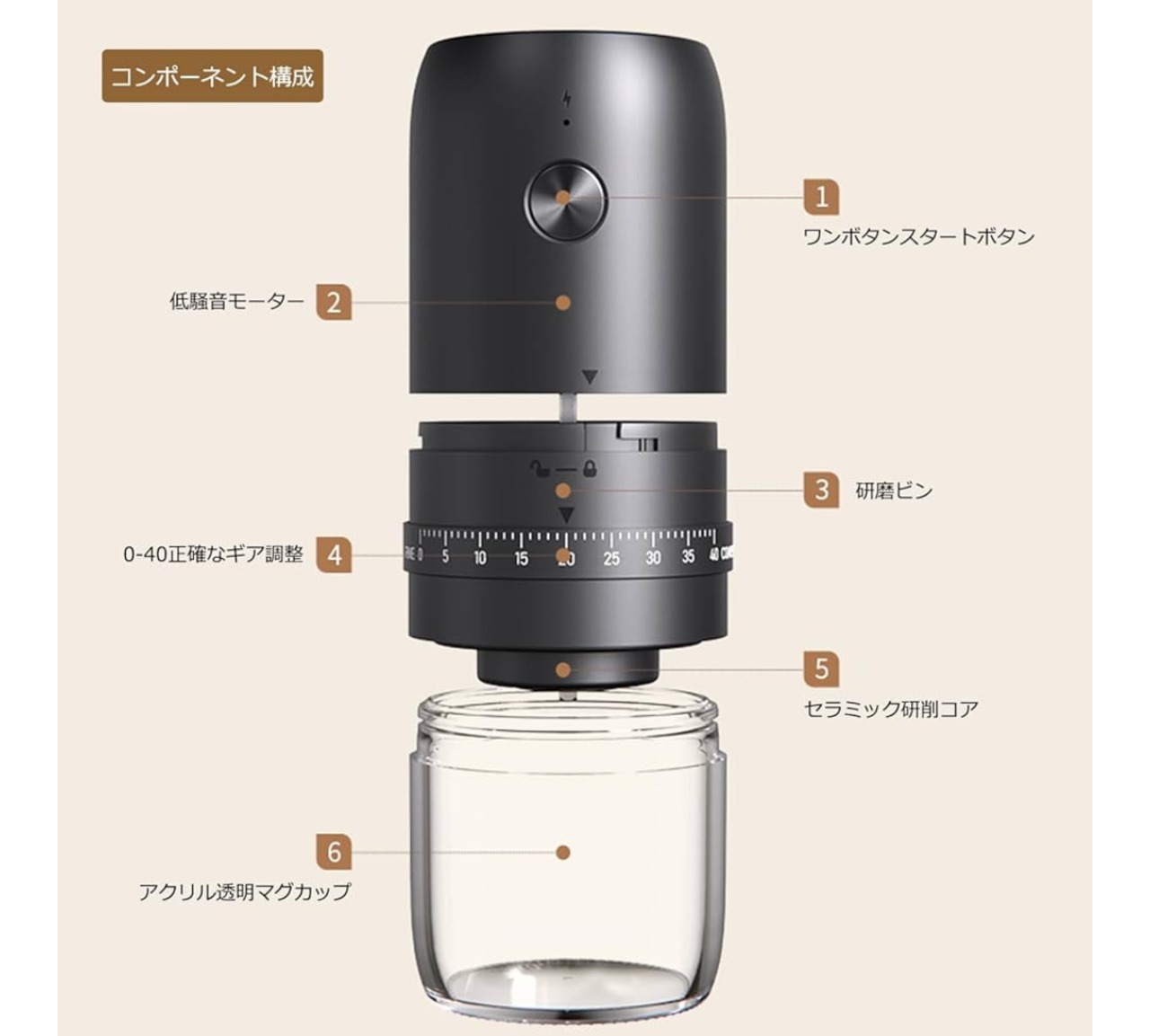 【ユニークなセラミック芯&ウォッシャブル】を採用。セラミックグラインダー芯は硬くて錆びにくいセラミック素材を採用し、粉砕時に熱が発生しないので、コーヒー豆の酸化や香りの低下を抑えます。コーヒーグラインダー電動は、本体部分、豆入れ部分、粉入れ部分、グラインダー芯部分をそれぞれ交換することで、簡単に分離することができます。コーヒーグラインダー電動は、本体部分は乾いた布で拭く程度で、その他の部分は水で洗うことができます。