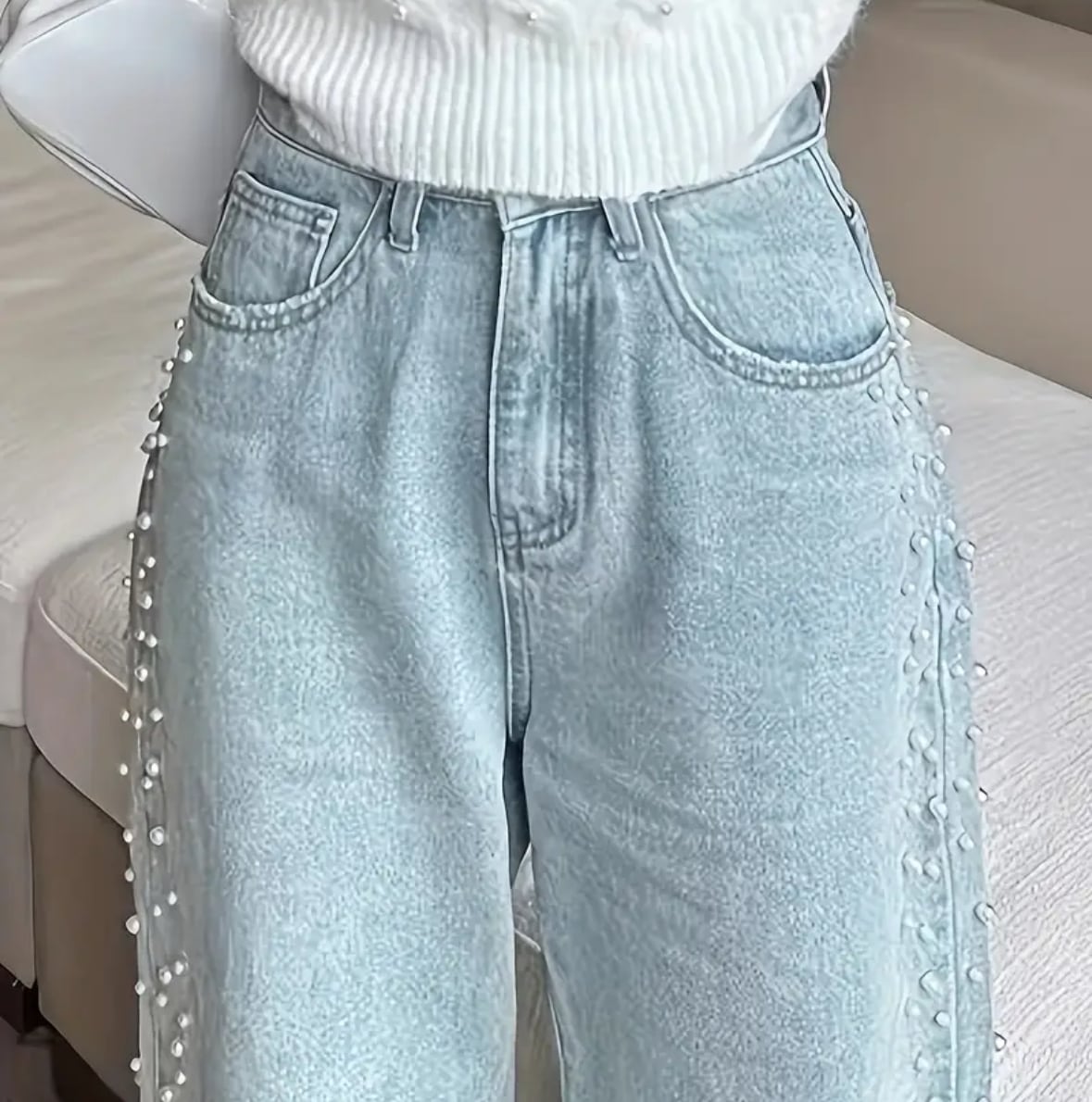 ヴィンテージ感のあるウォッシュ加工に、繊細なパールをサイドにあしらった、ありそうでなかったデザインデニム。定番のワイドシルエットながら、他にはないディテールが着こなしを格上げします。