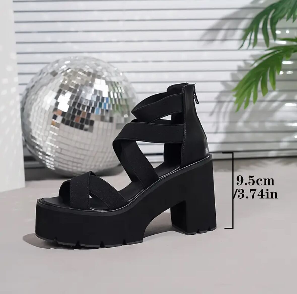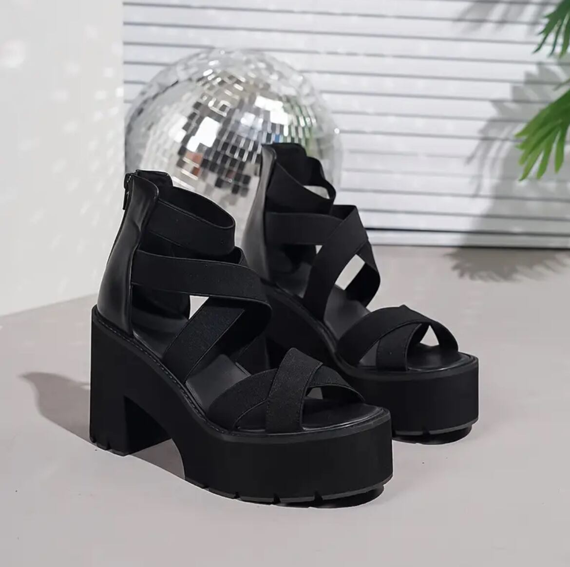 厚底のプラットフォームと安定感のあるチャンキーヒールが、履くだけでスタイルアップを叶えるサンダル。