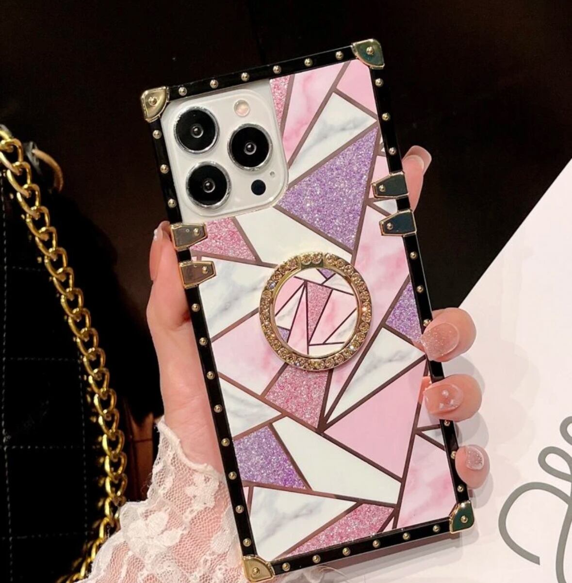 【在庫限り】ピンクと白の幾何学大理石模様×ゴールド縁取りの豪華デザイン!