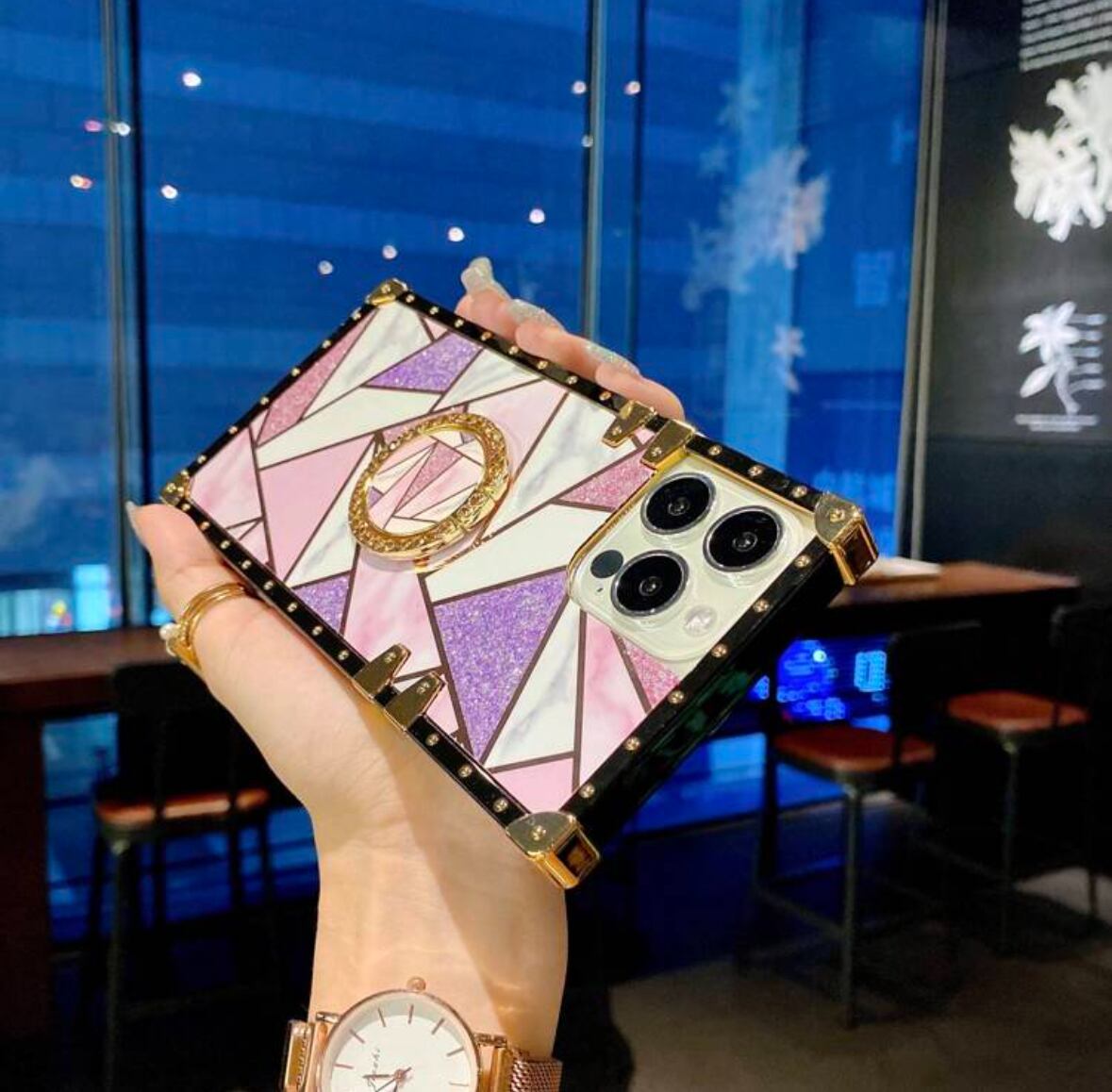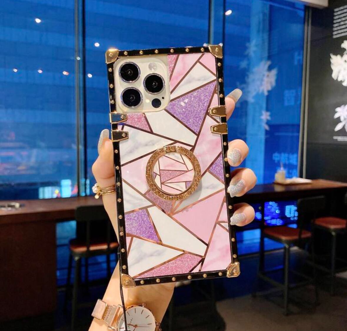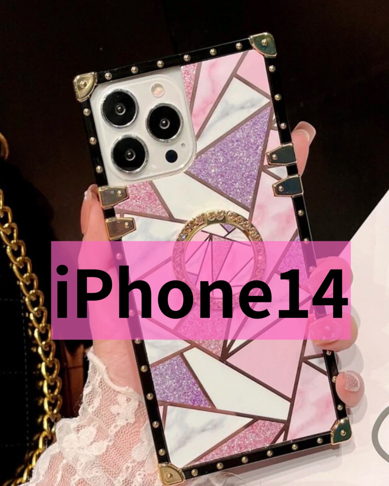 【在庫限り】ピンクと白の幾何学大理石模様×ゴールド縁取りの豪華デザイン!