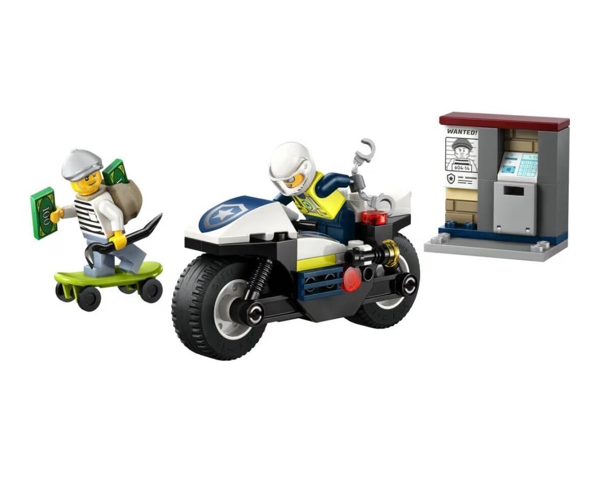 セット内容 – ポリスバイクの組み立てに必要なパーツ、スケートボード、ATM、ドロボウと警察官のミニフィギュア