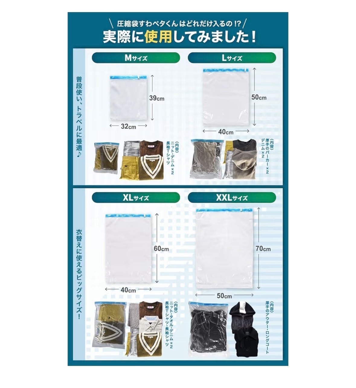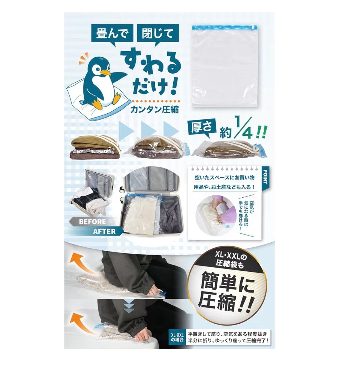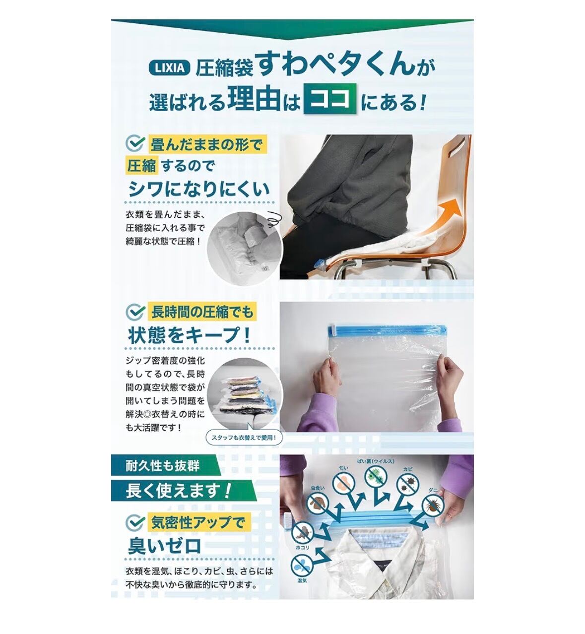 ✅【 上から座るだけ。わずか5秒で圧縮 】 LIXIAのすわペタくんは独自開発の構造により嵩張る衣類をわずか5秒ほどで力を使わず、上から座るだけで荷物の量が約1/2〜1/4ほどのサイズに変身!是非LIXIAの圧縮袋で荷物に囚われない旅行をお楽しみください!