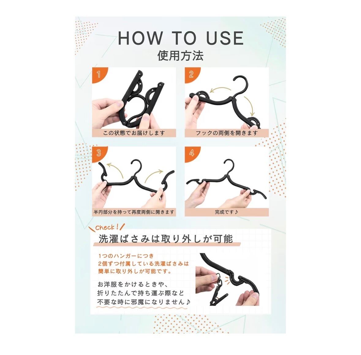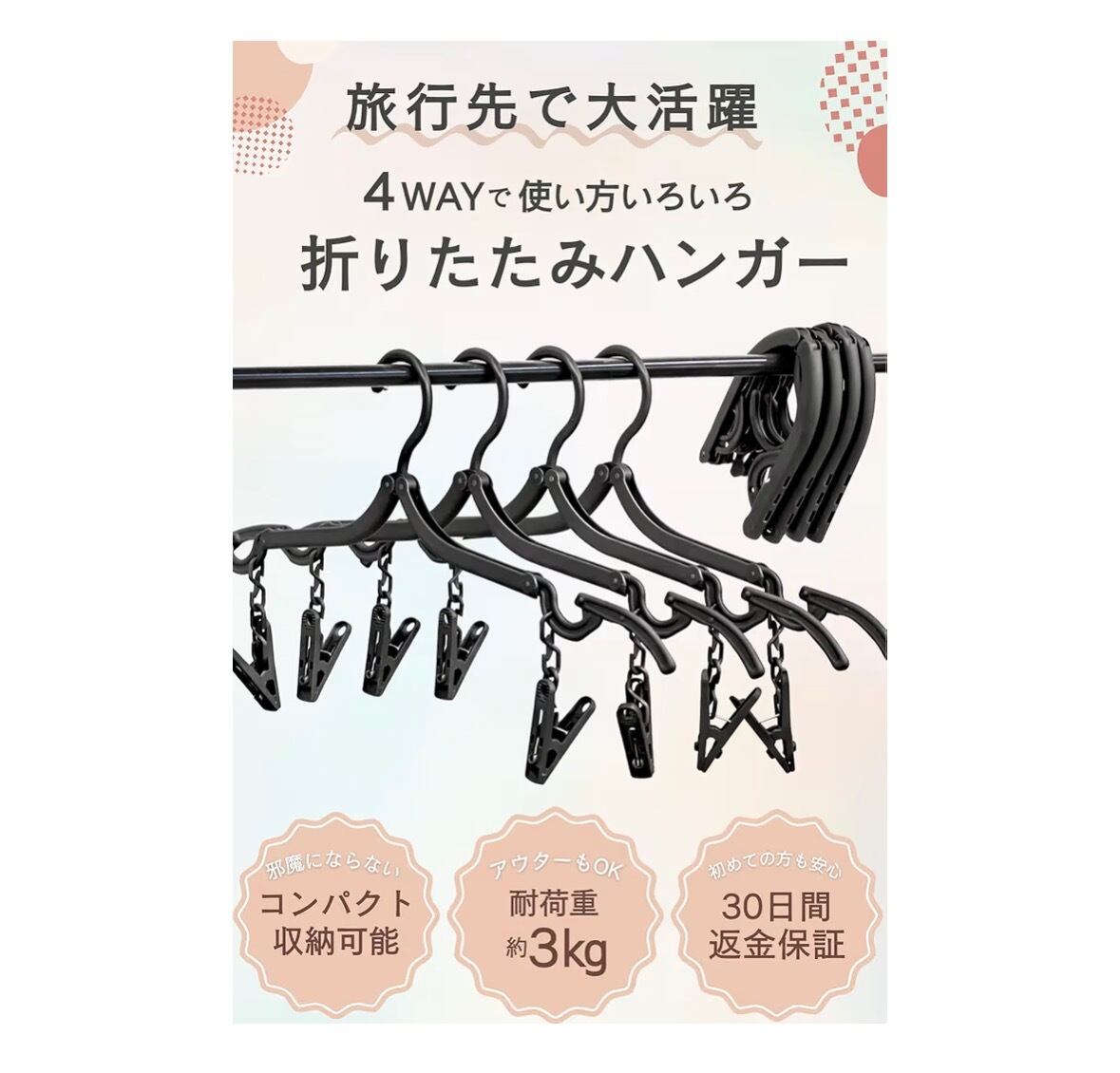 【旅行の新定番!コンパクトな4way折りたたみハンガー】 携帯ハンガー 8個セット ブラック 黒 折り畳み 洗濯ばさみ付き ピンチハンガートラベル用品 洗濯物干し 旅行用 海外旅行 入院 便利グッズ