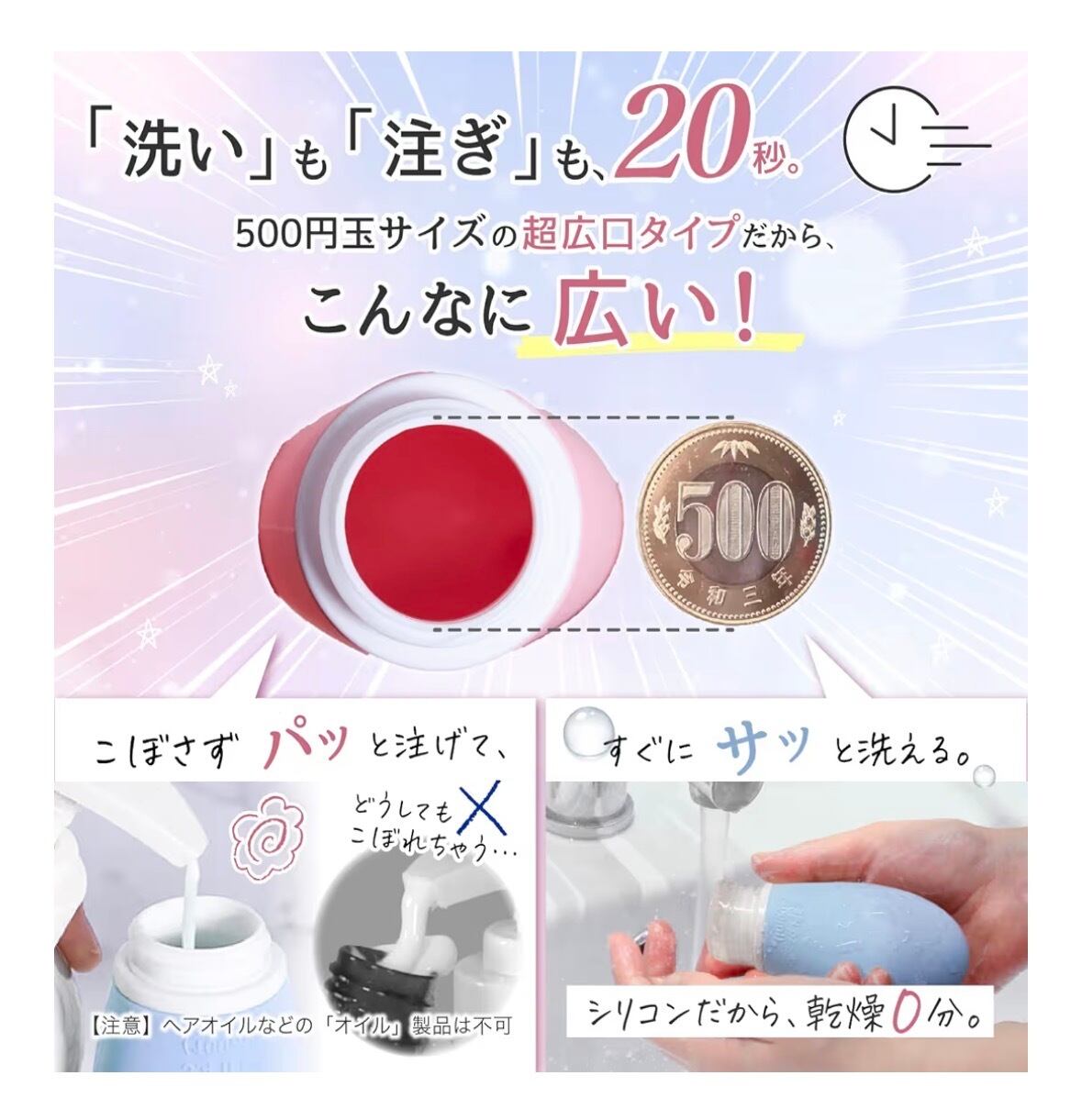 ✅【⭐洗いも注ぎもパパっと20秒で⭐】 従来の トラベルボトル は注入口が狭いことで詰め替え時に液体がこぼれたり、洗いにくかったりとお世辞にも 便利グッズ とは言えませんでした。しかし、TAYOTTEの トラベルボトル はなんと500円玉も入る超広口タイプに進化。 シャンプー を注ぐときやボトル本体を洗うときもラクラクで、 旅行用 にぴったりな 詰め替えボトル です。