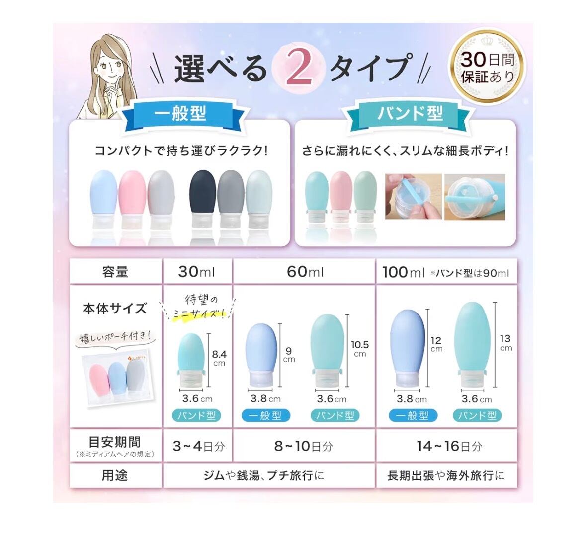 ✅【⭐シーンに合わせて選べる3タイプ⭐】 サイズは60ml・90mlの2種類。必要な量だけを入れて使える 詰め替えボトル として、短期の外出から長期 旅行 まで、あらゆるシーンで活躍します。どのサイズも飛行機内に持ち込めるので、 旅行用 の トラベルボトル としても最適です。