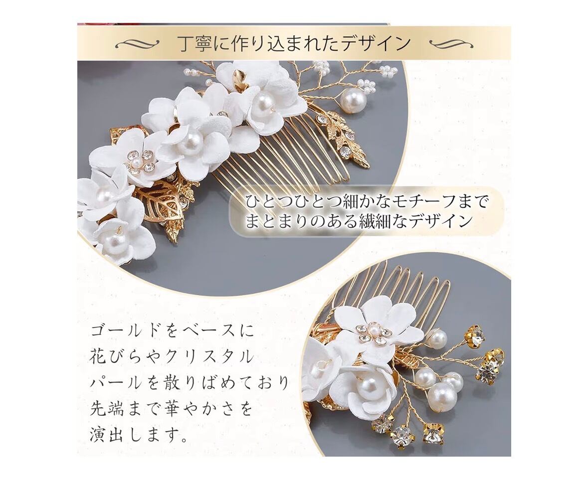 華やかなゴールドをベースに花びらやクリスタルパールを散りばねておりワイヤーの先端まで彩りを演出します。