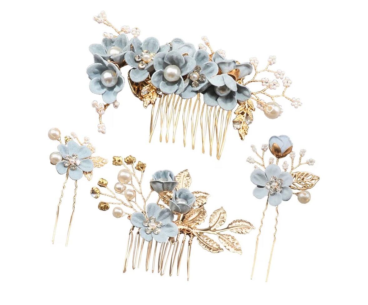 ブルーをベースにフラワー・パール・ストーンデザインのヘッドドレス(コーム&Uピン 4種セット)です。
