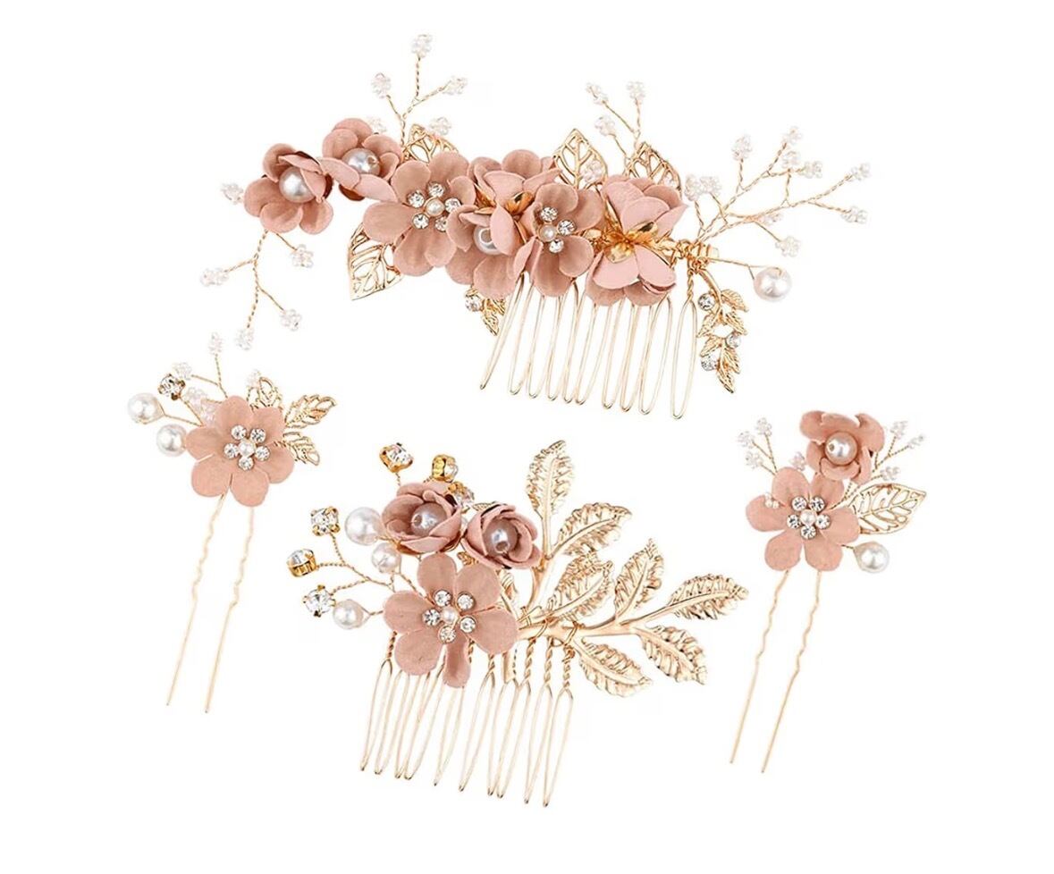 ピンクをベースにフラワー・パール・ストーンデザインのヘッドドレス(コーム&Uピン 4種セット)です。