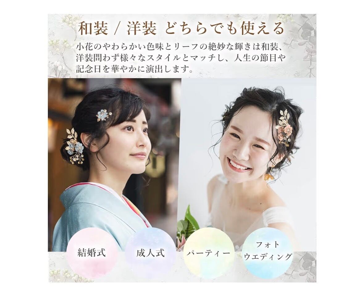 洋装/和装どちらでも使える。小花のやわらかい色味とリーフの絶妙な輝きは和装、洋装問わず様々なスタイルとマッチします。人生の節目や記念日を華やかに演出します。