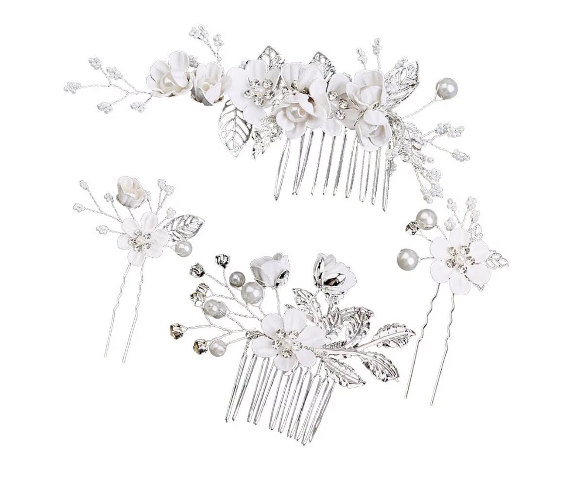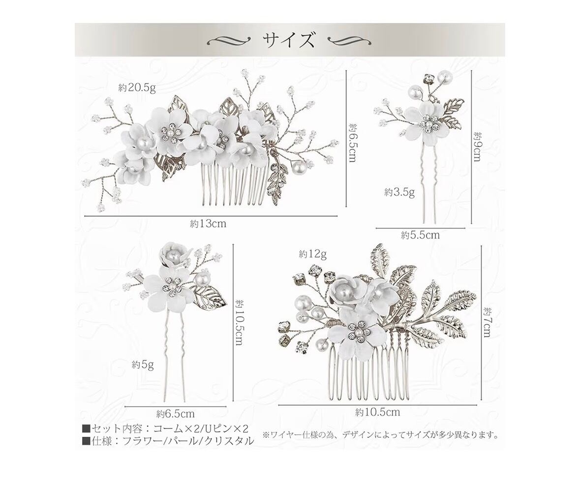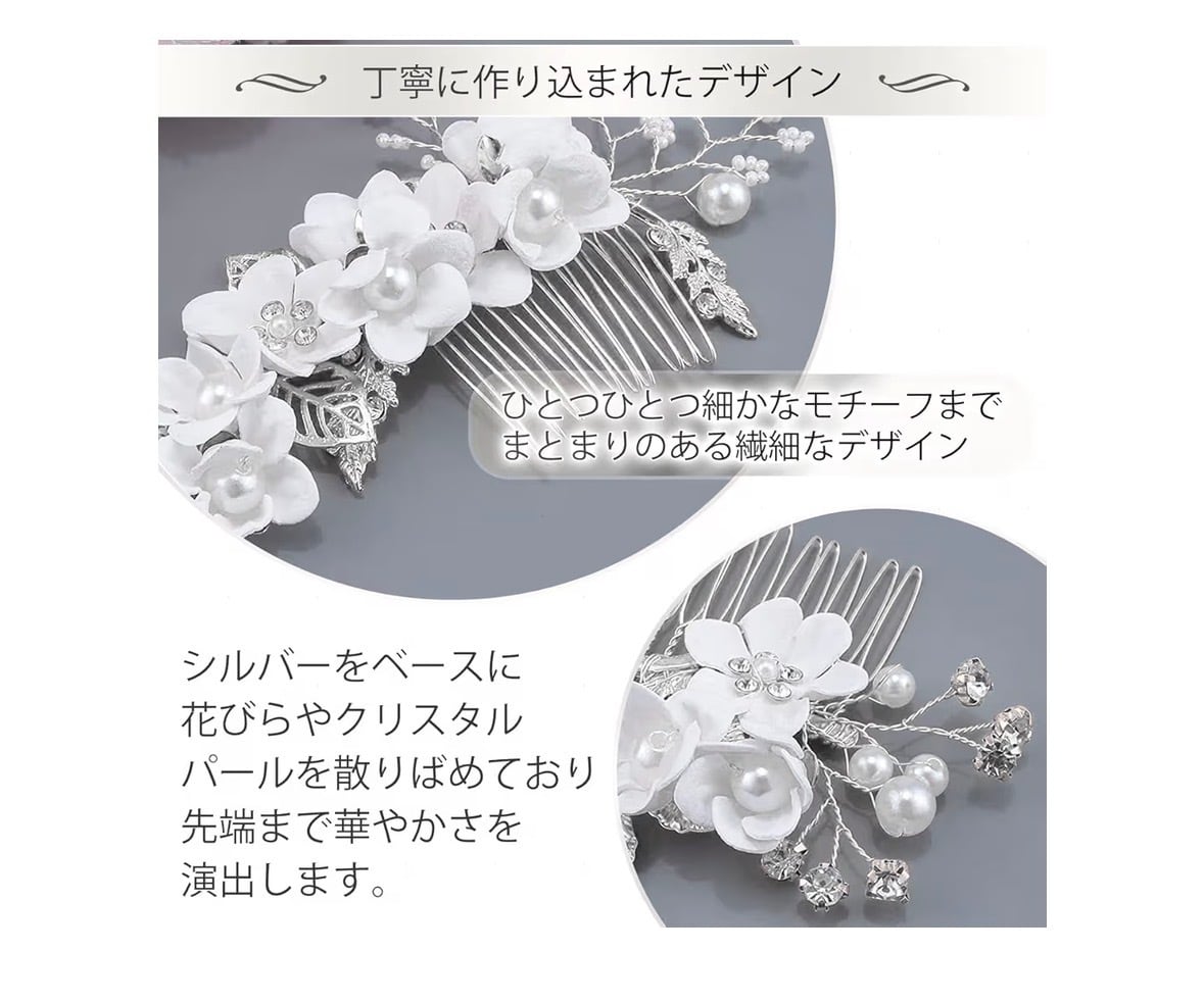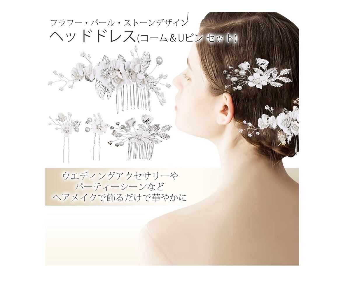 シルバーをベースにフラワー・パール・ストーンデザインのヘッドドレス(コーム&Uピン 4種セット)です。