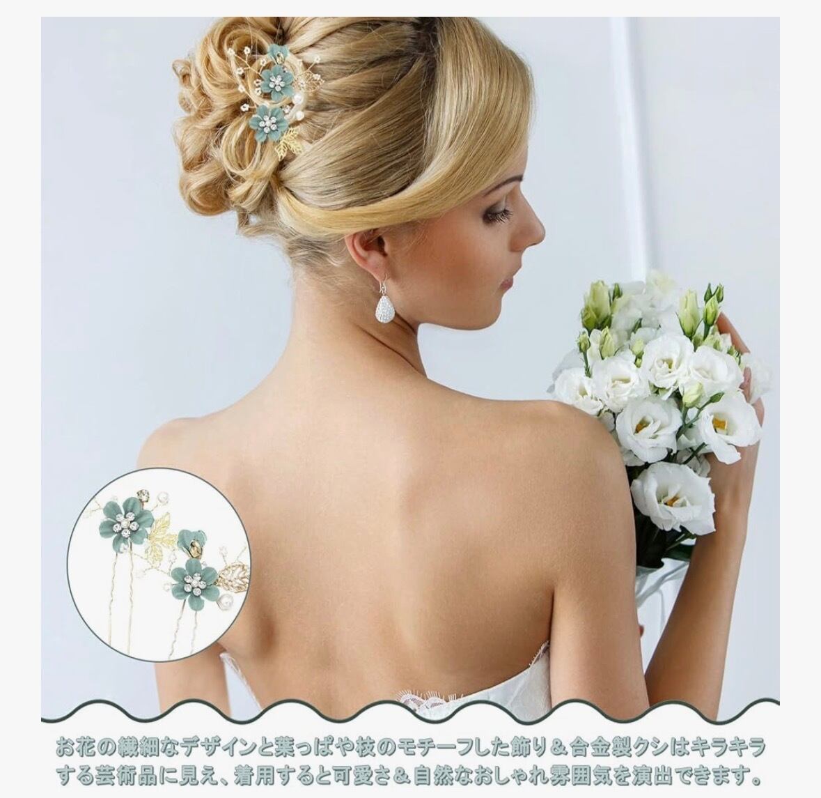 髪飾り ヘアアクセサリー 大人 和装 かんざし ヘッドドレス 3点セット パール 花 ヘアピン 着物 浴衣 発表会 成人式 卒業式 結婚式 ウェディング 和風 小物 グリーン
