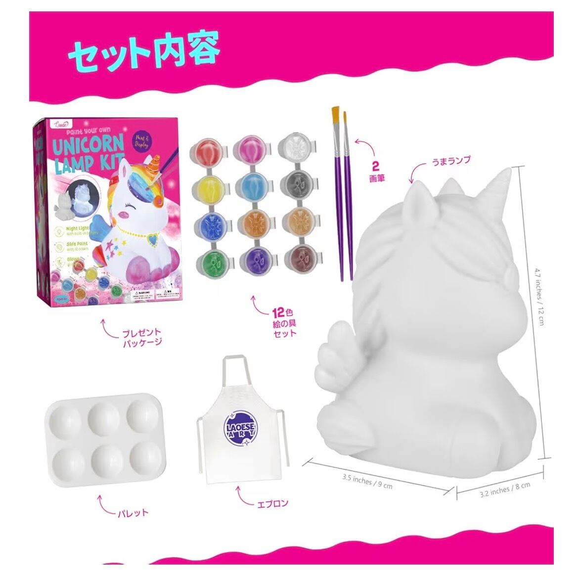 【セット内容】ユニコーンランプ、絵具セット、絵筆2本、パレット1個、エプロン1枚
