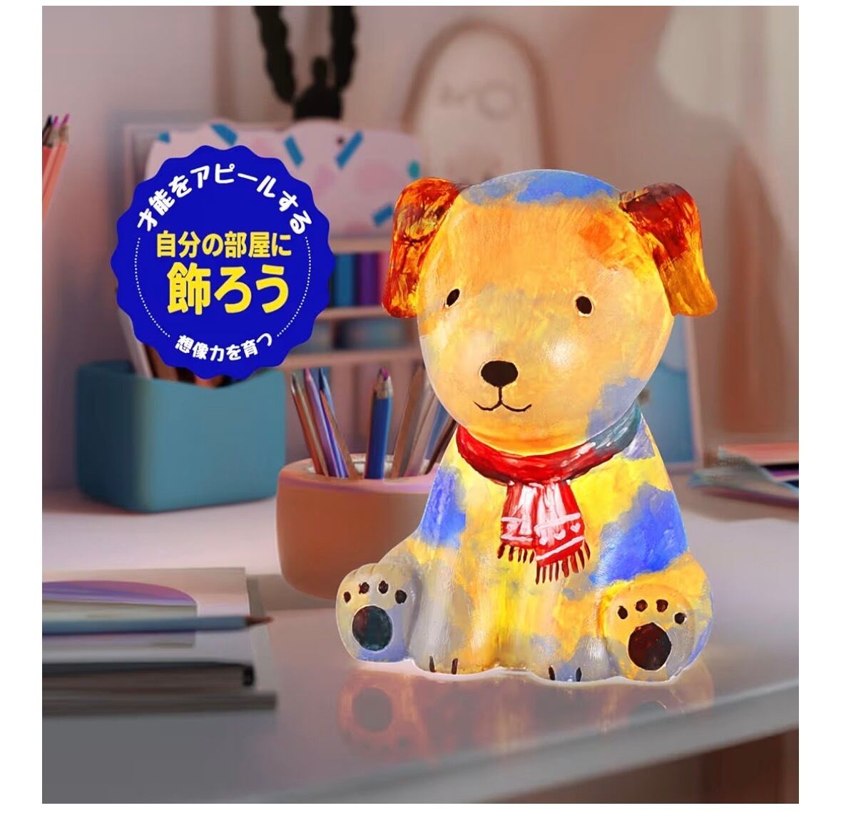 「子自分だけのいぬランプを描こ」このお絵描きキットなら、想像力を広げながら、お好きな色で自由にiいぬの姿を描き、世界にひとつだけのランプを作ることができます。完成したランプもお部屋の雰囲気を可愛らしく演出します。きっとお子さまにとって、いつまでも大切にしたくなる宝物になるでしょう。