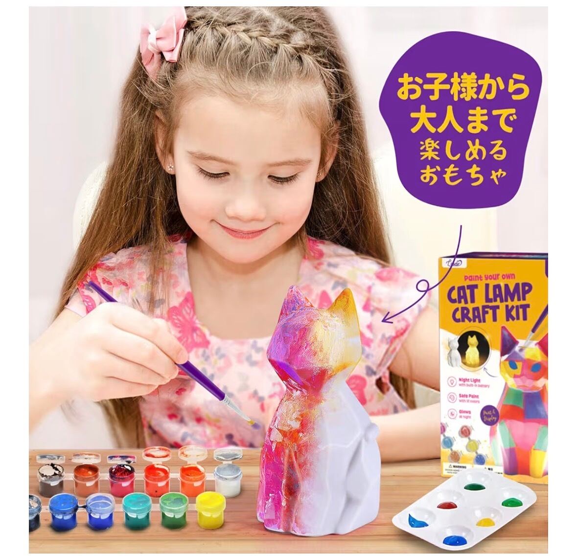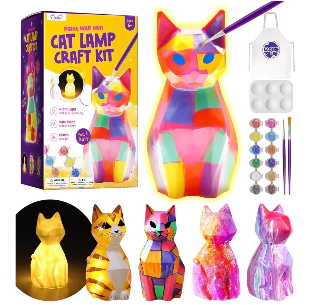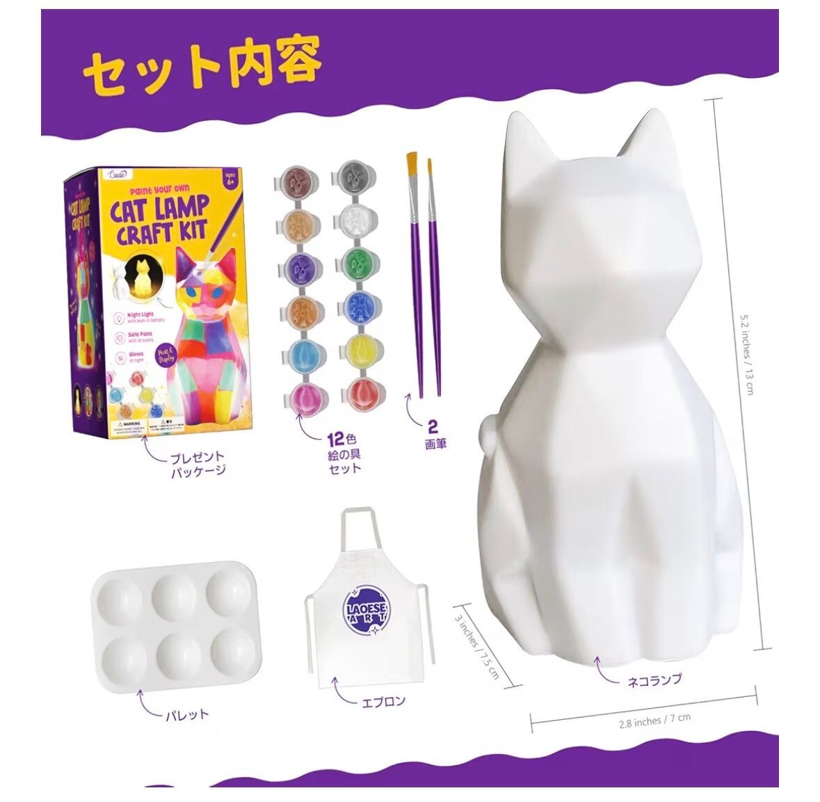 【セット内容】猫ランプ、絵具セット、絵筆2本、パレット1個、エプロン1枚