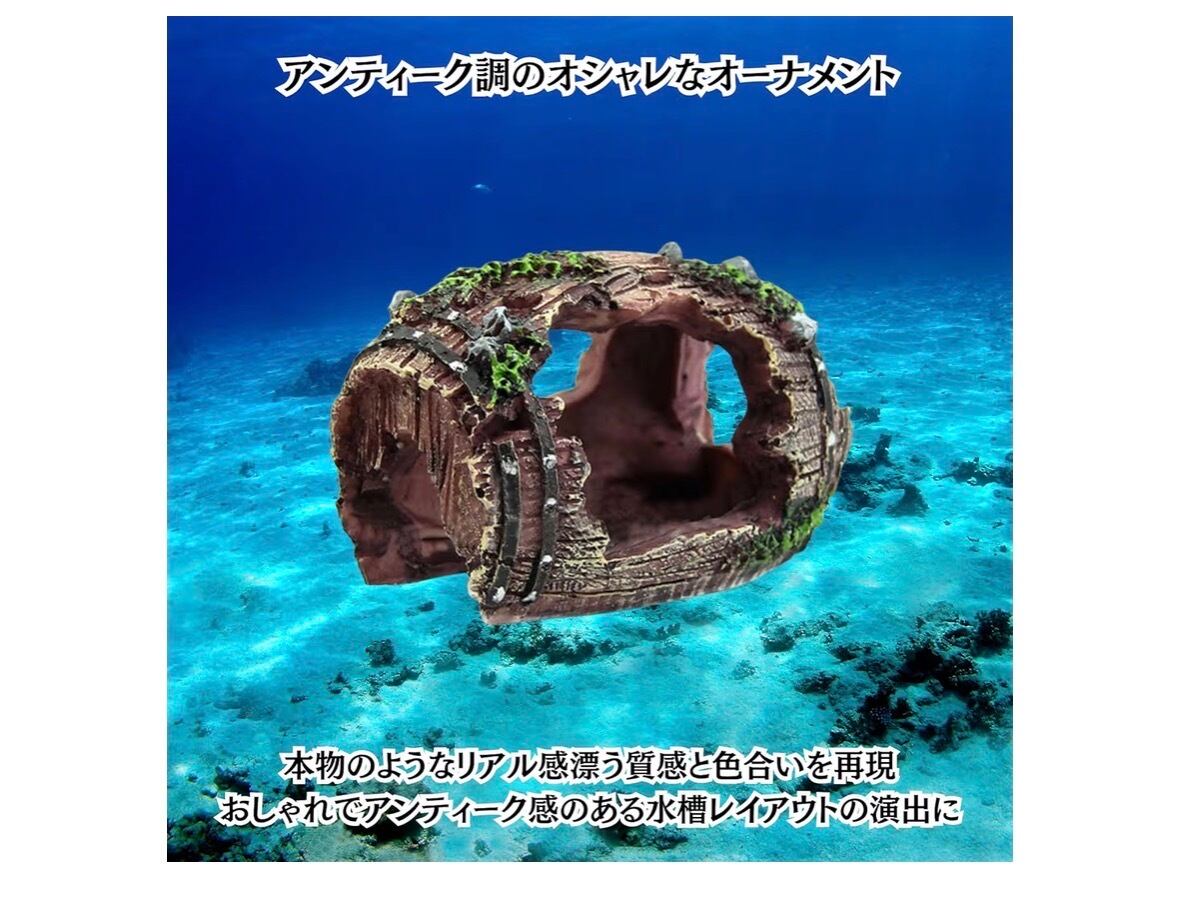 沈没船の積み荷を連想させる、アンティークな樽をモチーフにしたアクアリウム用オブジェです。深みのあるブラウンカラーが水槽内に落ち着いた雰囲気を出し、水草の鮮やかな緑をより一層引き立てます。