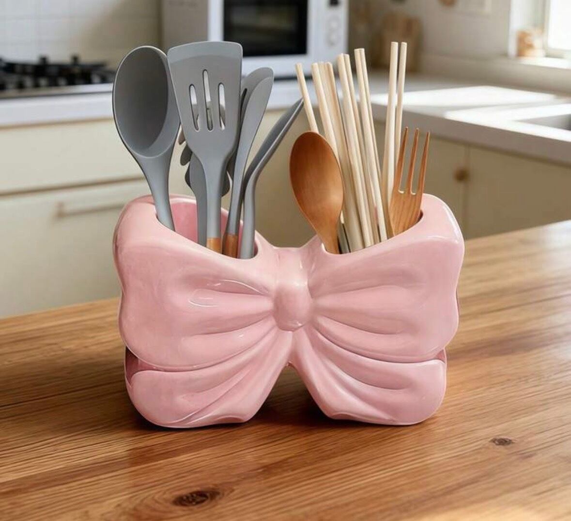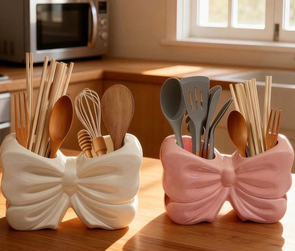 存在感のある大きなリボンモチーフが、キッチンカウンターやデスク周りのアクセントに。甘すぎないくすみピンクのカラーは、モダンなインテリアとも相性抜群です。