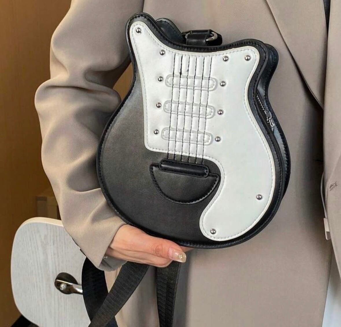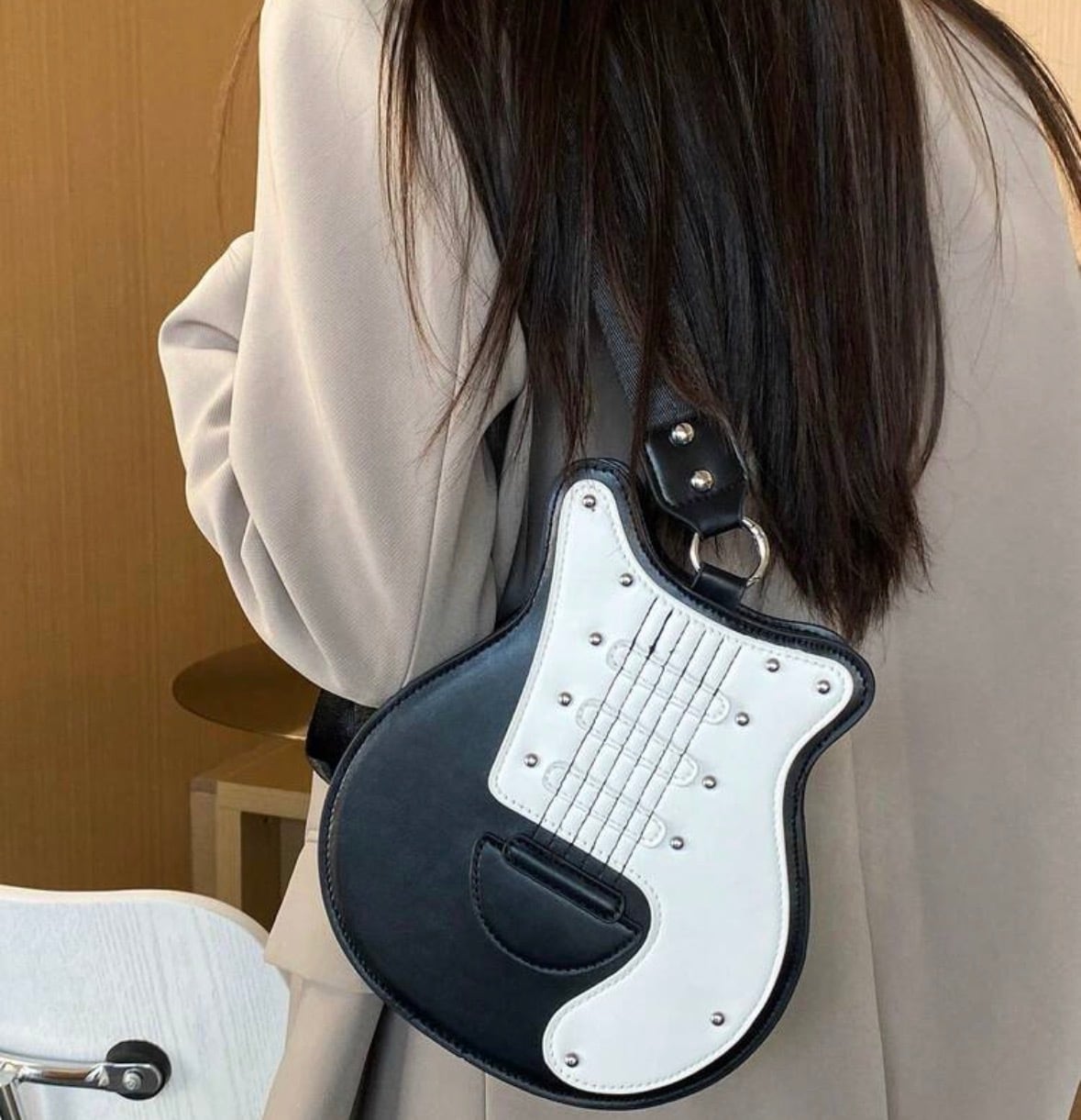 ステッチで表現された弦や、ピックガードをイメージしたバイカラーの切り替えなど、細部までこだわりが詰まっています。